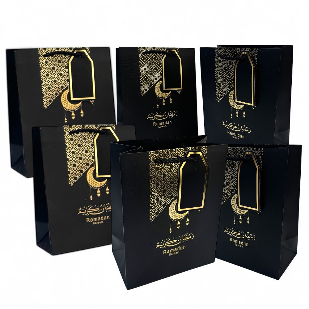 Celebrate Ramadan with Doodle Kiddo 6 Pcs Black & Gold Ramadan Kareem Gift Bags. Featuring elegant Arabic & English messages, these premium black and gold bags add a festive touch.
